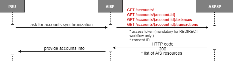 To access all AIS API, a valid consent established between the TPP, the PSU and the ASPSP is required. In addition, when TPP are using the REDIRECT workflow, they must also provide the access token related to the given consent. The APIs accessible with this consent are listed below. All specifications of these APIs can be found on the API page of this developer portal.
